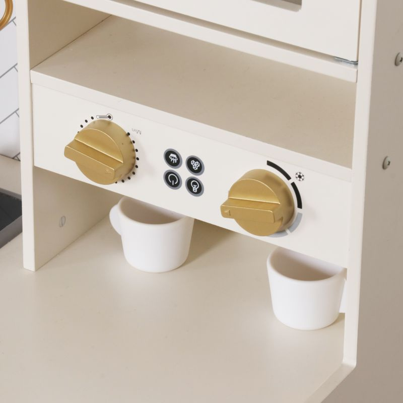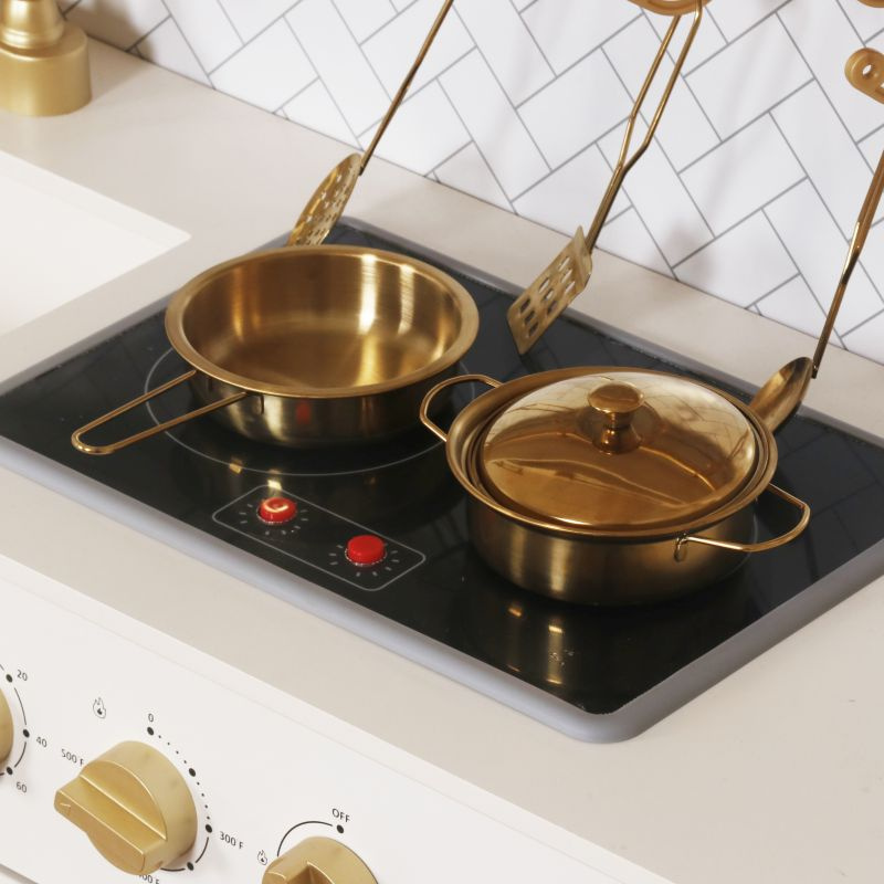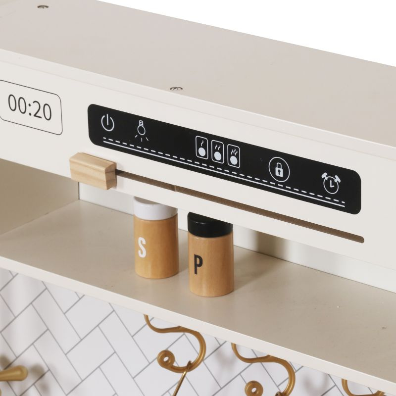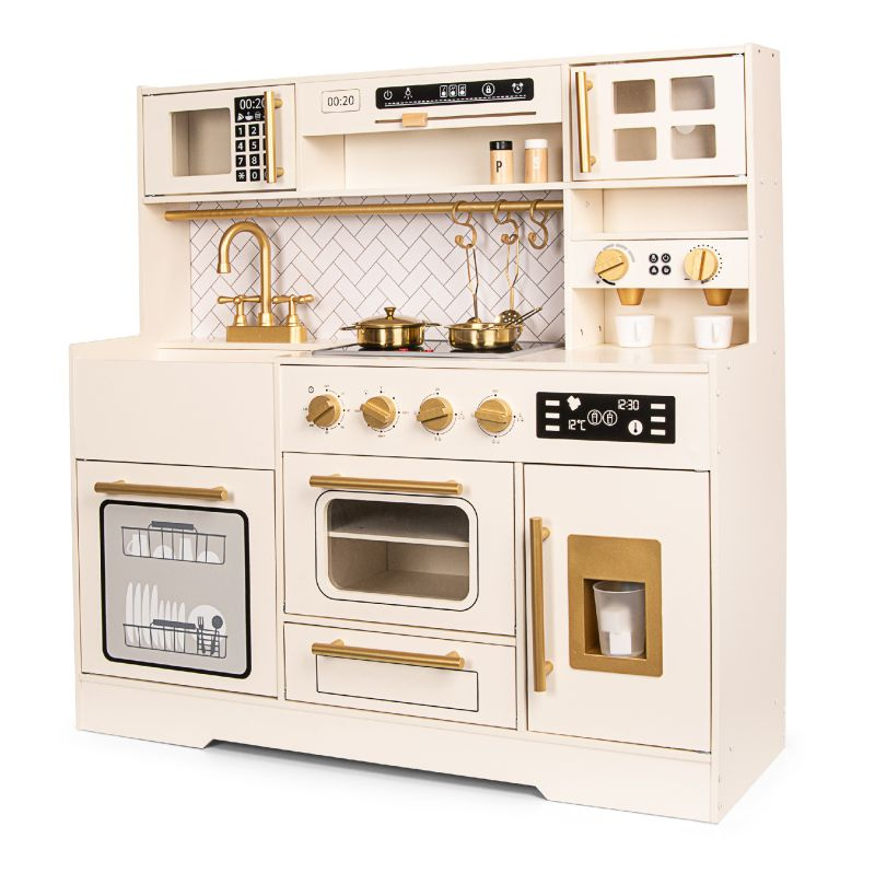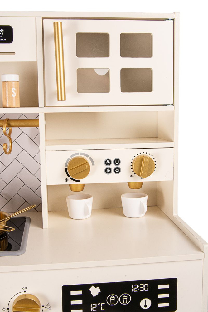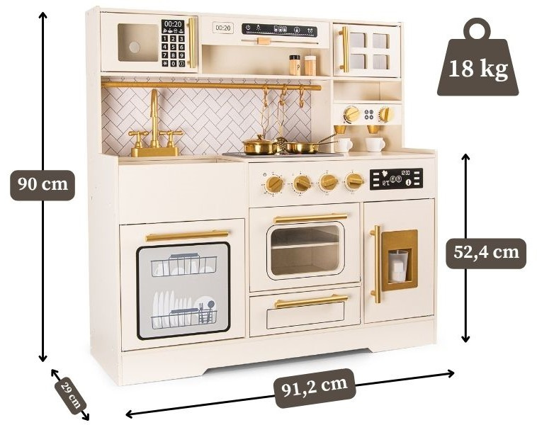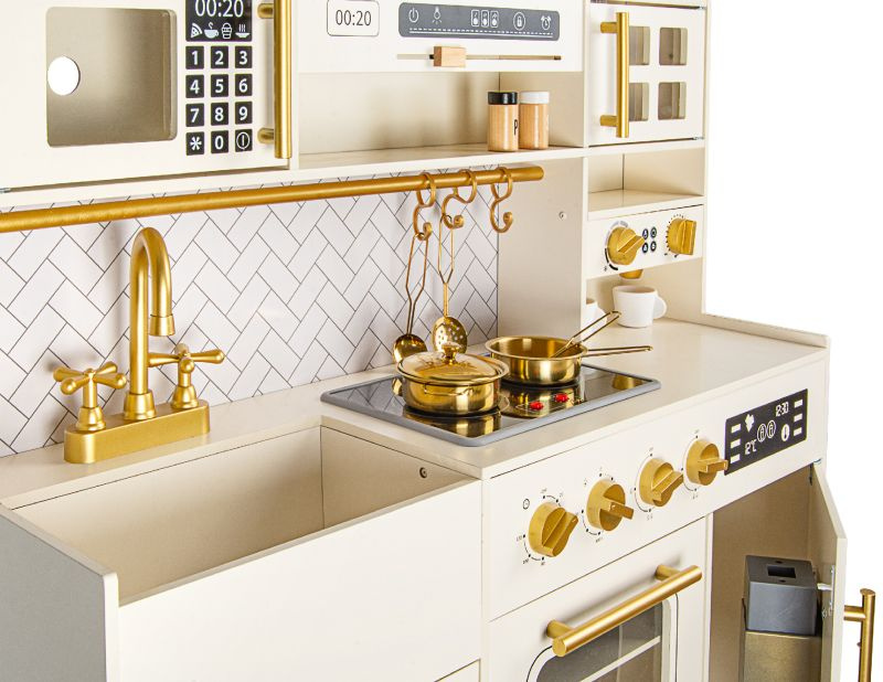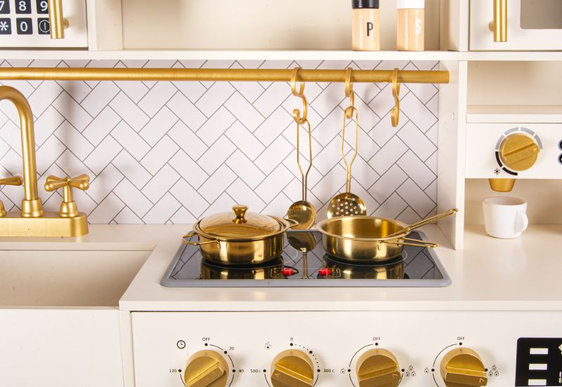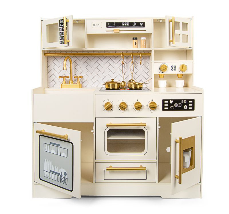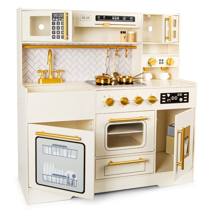 Elegancka drewniana kuchnia zabawkowa dla dzieci z bogatym zestawem akcesoriów rozwija kreatywność i uczy poprzez zabawę. To idealny wybór na prezent dla dziewczynki lub chłopca, który marzy o własnym kąciku kulinarnym.