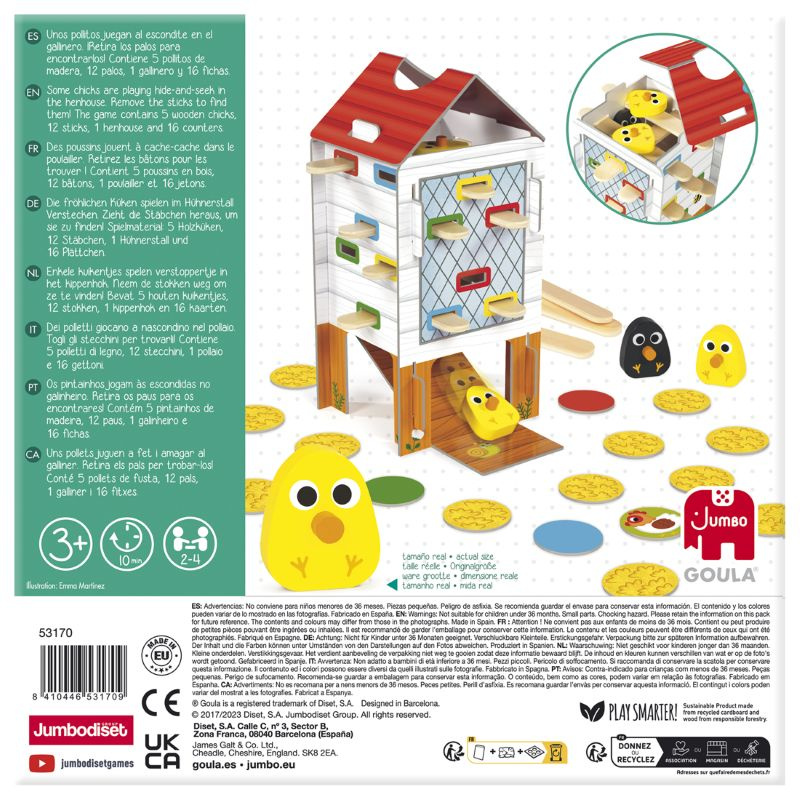 Wesołe kurczaczki chowają się w kurniku i czekają, aż ktoś je odnajdzie. Gra Happy Chickens Goula to krótka, pełna emocji rozgrywka dla dzieci od 3 roku życia.