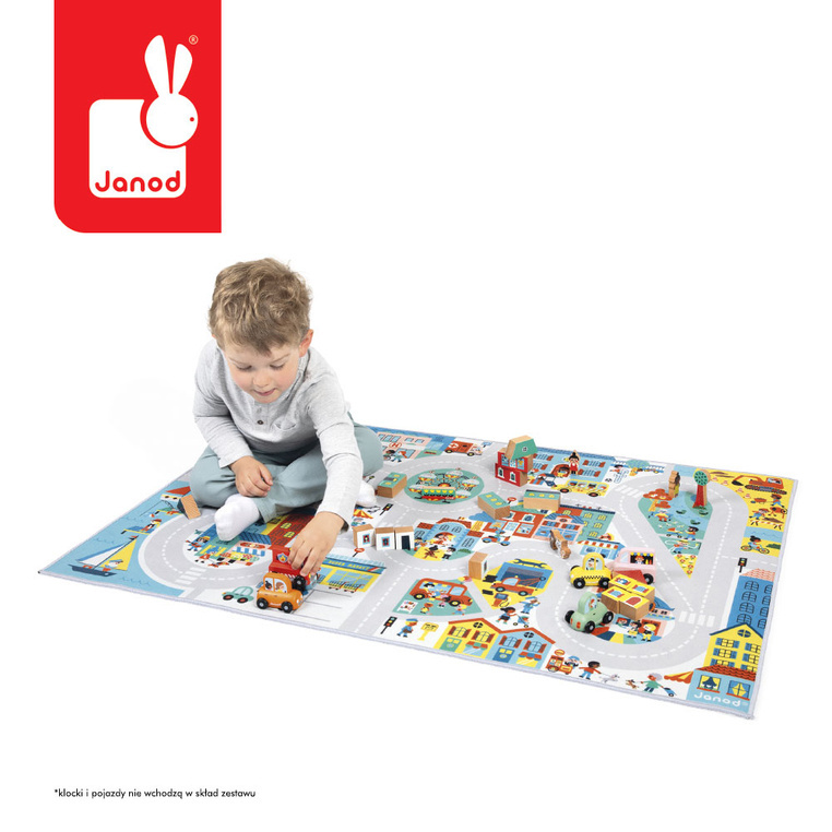 Mata do zabawy z drogą Miasto Cross Roads Janod przenosi dzieci w tętniący życiem, kolorowy świat miejskich ulic i budynków. Maluchy mogą odkrywać szczegóły, tworzyć własne historie i rozwijać wyobraźnię podczas bezpiecznej, kreatywnej zabawy.