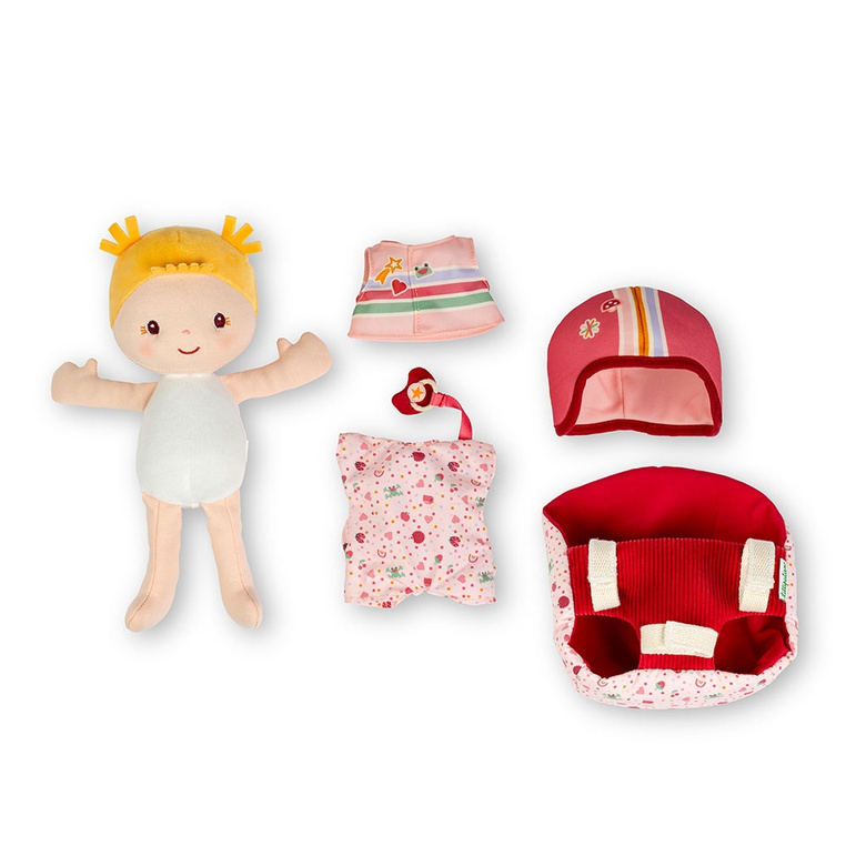 Lena ma 23 cm wysokości, zdejmowany rampers, magnetyczny smoczek, jasne włosy i miękkie ciało przyjazne dla małych rączek. W zestawie znajduje się fotelik rowerowy z rzepami, kamizelka i kask – wszystko, czego potrzeba do bezpiecznej zabawy.