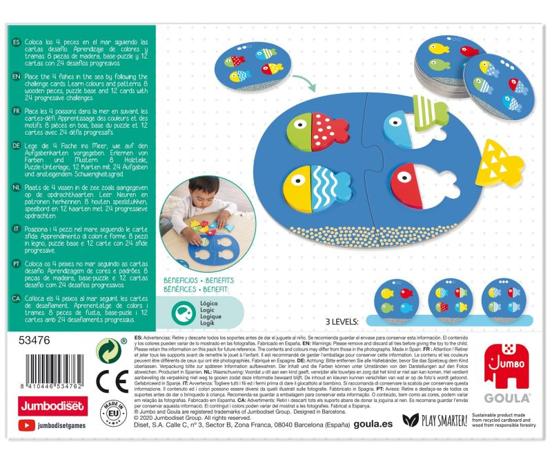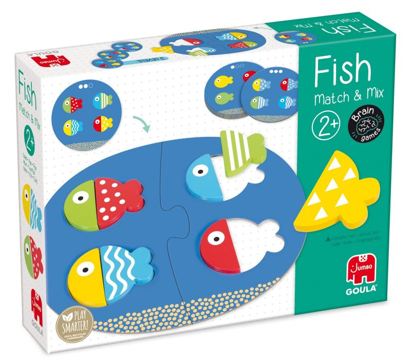 Pełna koloru i radości gra Fish Match & Mix Goula uczy najmłodsze dzieci dopasowywania wzorów i kolorów. Trzy poziomy trudności pozwalają rozwijać umiejętności krok po kroku, w naturalny i przyjemny sposób.