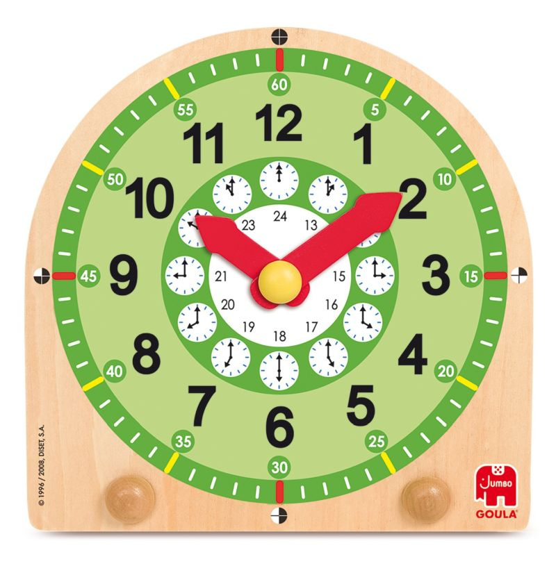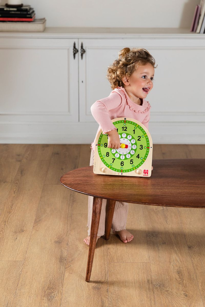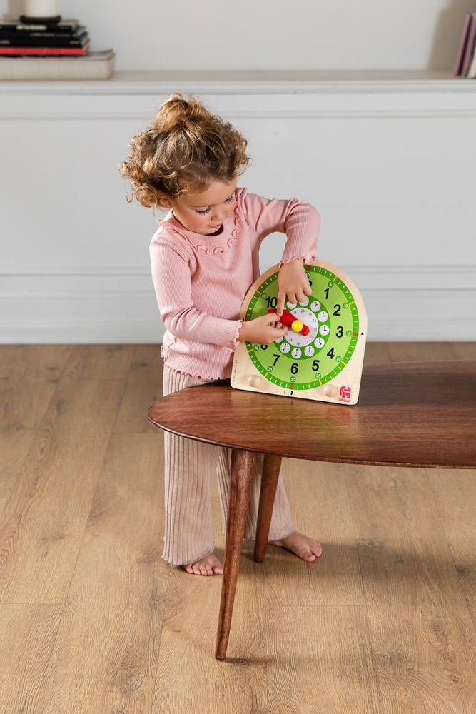 Drewniany zegar Goula pomaga dzieciom poznać tajniki czasu i nauczyć się odczytywać godziny w przyjazny, kolorowy sposób. To idealna pomoc edukacyjna dla maluchów zaczynających przygodę z nauką zegara.