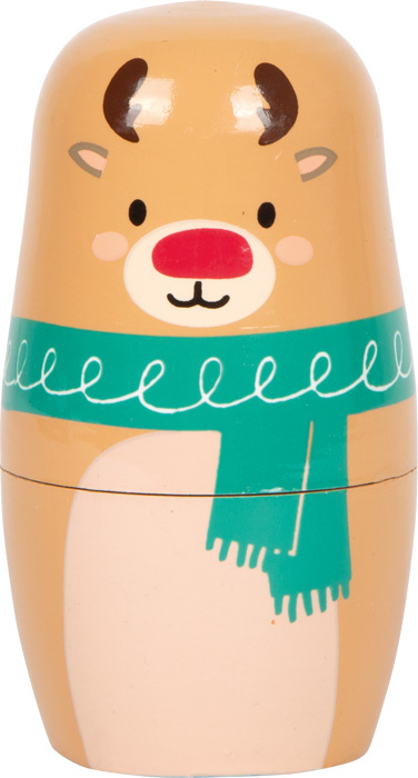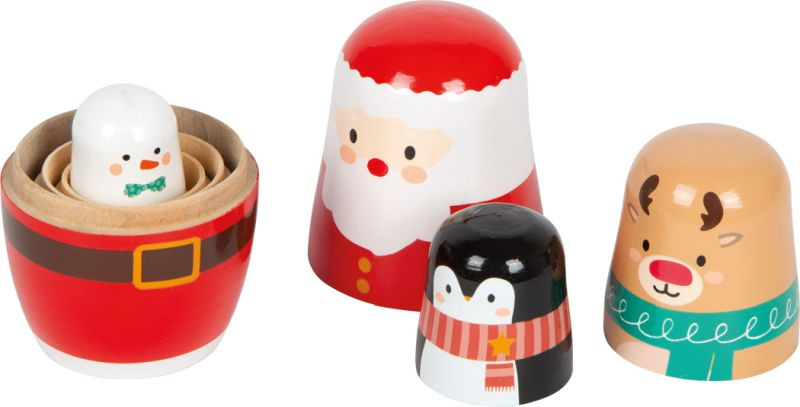 Cztery drewniane matrioszki Small Foot z motywem Bożego Narodzenia wprowadzą świąteczny nastrój do każdego pokoju. Idealne do zabawy, ale sprawdzą się też jako dekoracja. Rozwijają zręczność i sprawiają, że każde odkrycie kolejnej figurki wywołuje uśmiech.