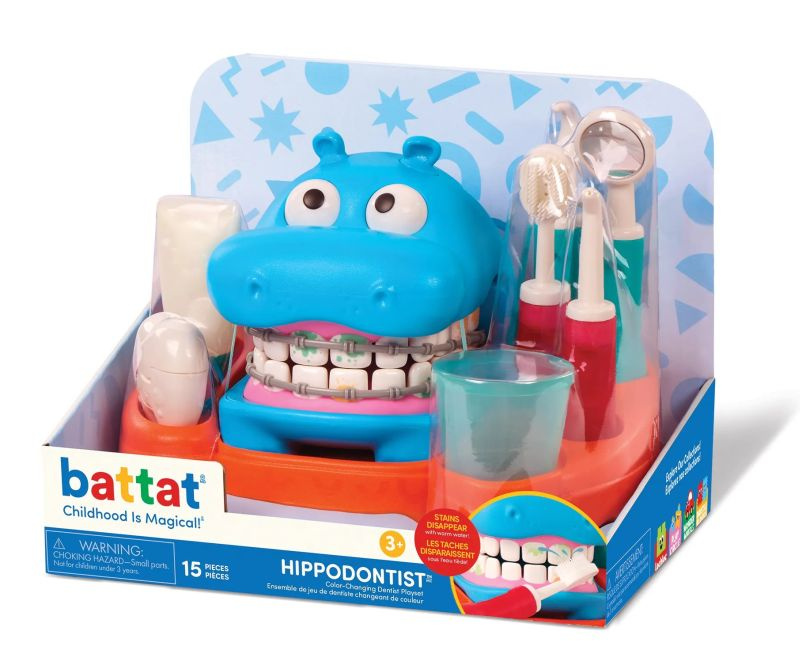 Zestaw Hipodonta Battat wprowadza dzieci w świat higieny jamy ustnej w sposób prosty i angażujący. Dzięki zmieniającym kolor zębom i realistycznym akcesoriom maluchy uczą się prawidłowego szczotkowania i przygotowują do wizyty u dentysty w formie zabawy.