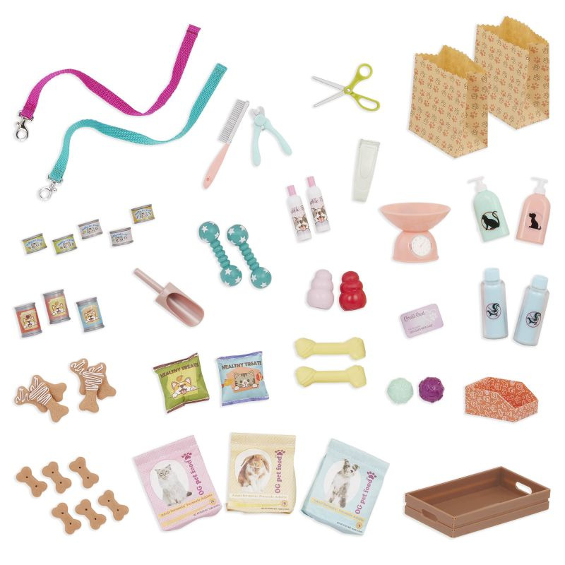 Zestaw Happy Tails Care Center pozwala dzieciom tworzyć własny salon i sklep dla zwierząt. To kompletne centrum zabawy dla lalek Our Generation, w którym realizm spotyka się z troską o ukochane pupile. Zestaw idealnie pasuje do lalek o wysokości 46 cm Our Generation (dostępnymi w naszej ofercie), ale także innych zbliżonych wielkości.