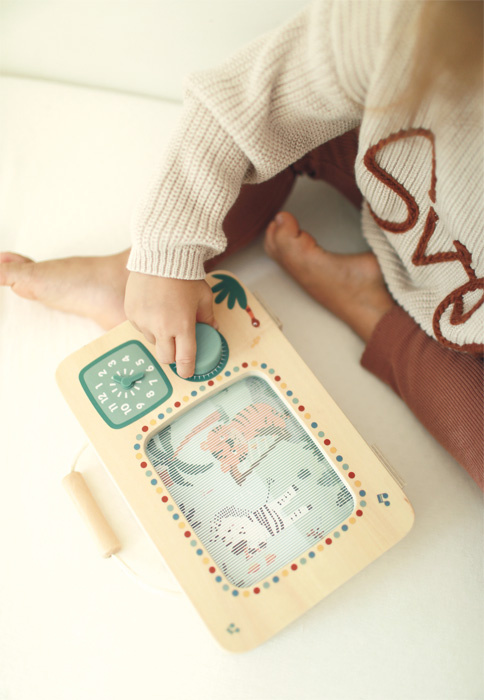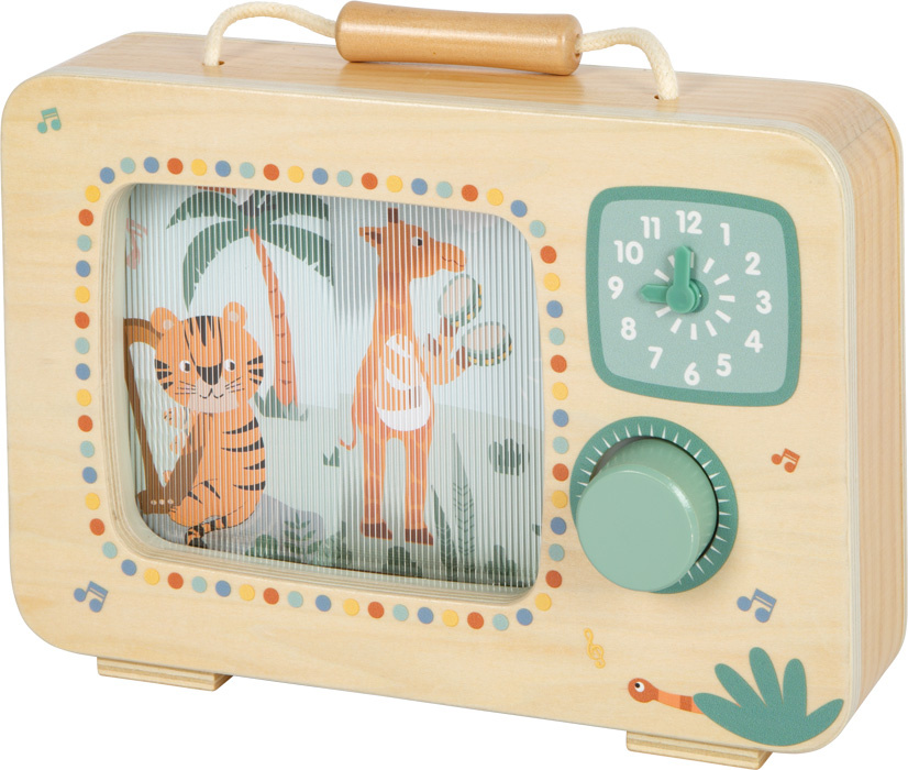 Pozytywka dla dzieci TV Safari Small Foot łączy muzykę, ruchomy obraz i piękne drewniane wykonanie, które przyciąga uwagę maluchów. To spokojna zabawka do obserwowania, słuchania i rozwijania pierwszych umiejętności motorycznych.