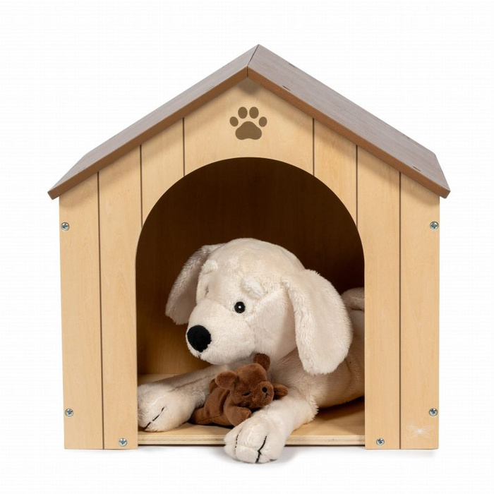 Przytulny drewniany domek, który pozwala stworzyć spokojną przestrzeń do zabawy dla pluszowych piesków. Idealny do odgrywania codziennych scen związanych z opieką i odpoczynkiem.