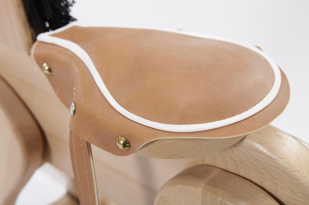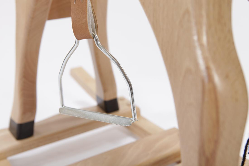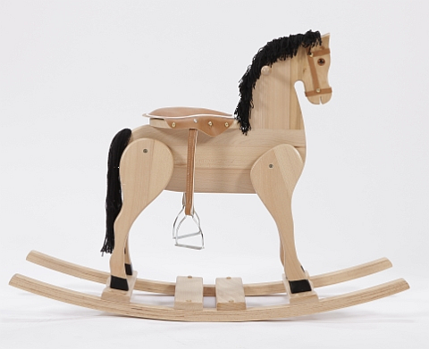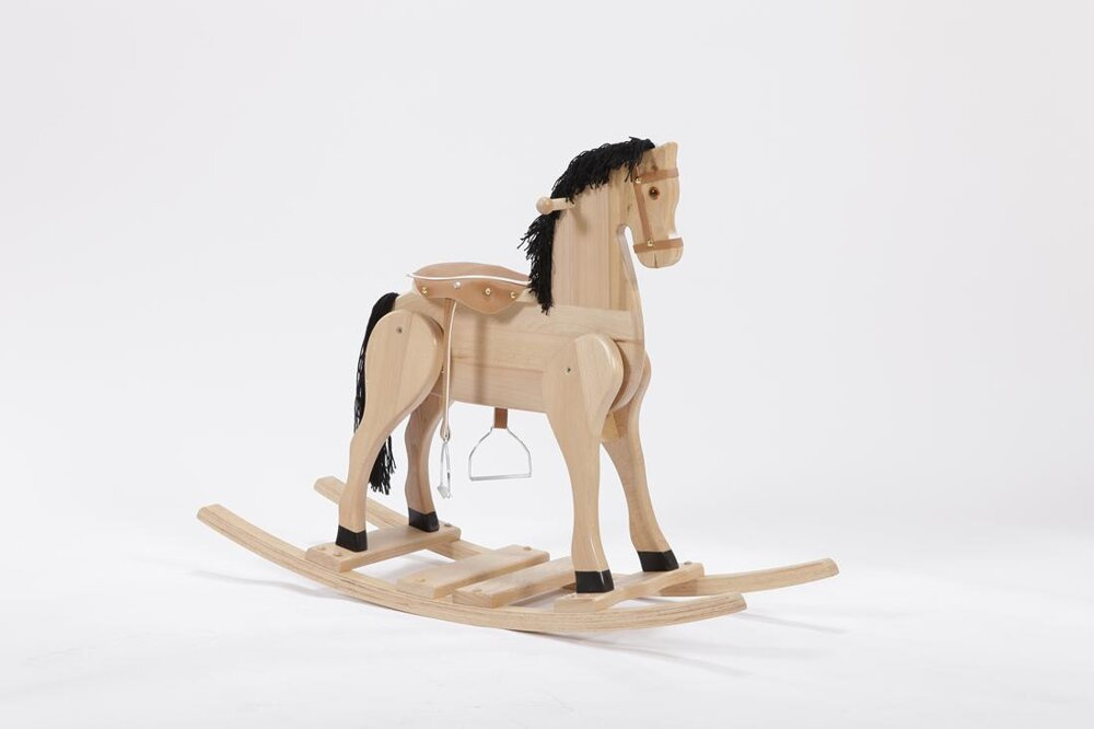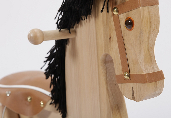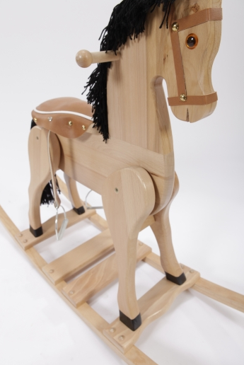 Piękny koń na biegunach wykonany jest w całości z litego, lakierowanego na lekki połysk drewna. Siodło ze strzemionami, czarna grzywa i ogon, lśniące oczy sprawiają, że konik jest niepowtarzalny. Posiada podnóżki i wypustki na płozach zabezpieczające przed zbyt mocnym przechyleniem.