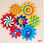 Układanka drewniana. Kolorowe koła zębate na podstawce, Goki